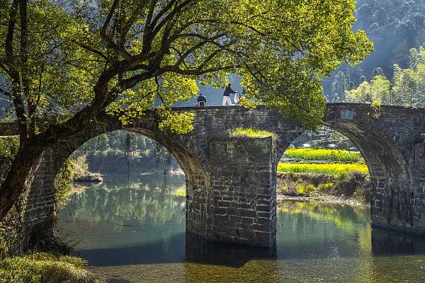黄姚古镇位于广西贺州昭平县东北部,因镇上以黄、姚两姓居多,故名“黄姚”。溪水在带龙桥下静静流淌,半月般的桥拱倒映水中,岸上人家炊烟袅袅,老人们在台阶上啜茶,孩子们奔跑或戏水…