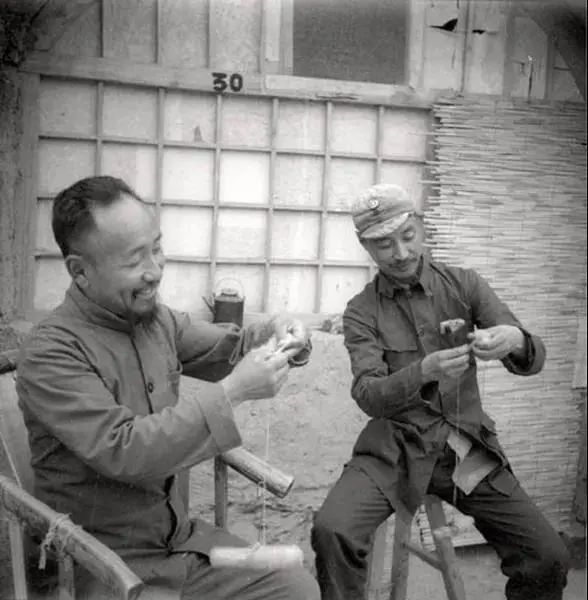 1944年,晋察冀边区参议会副议长于力(左)、高等法院院长王斐然在捻毛线。图片来自网络1948年,华北人民法院成立后,王斐然当选为华北人民法院审判委员会副审判长。