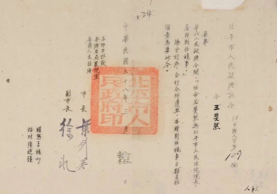 1949年,北平和平解放后,城市百废俱兴。3月15日,北平市人民政府奉华北人民政府之令,任命王斐然为北平市人民法院院长,训令由市长叶剑英、副市长徐冰签发。
