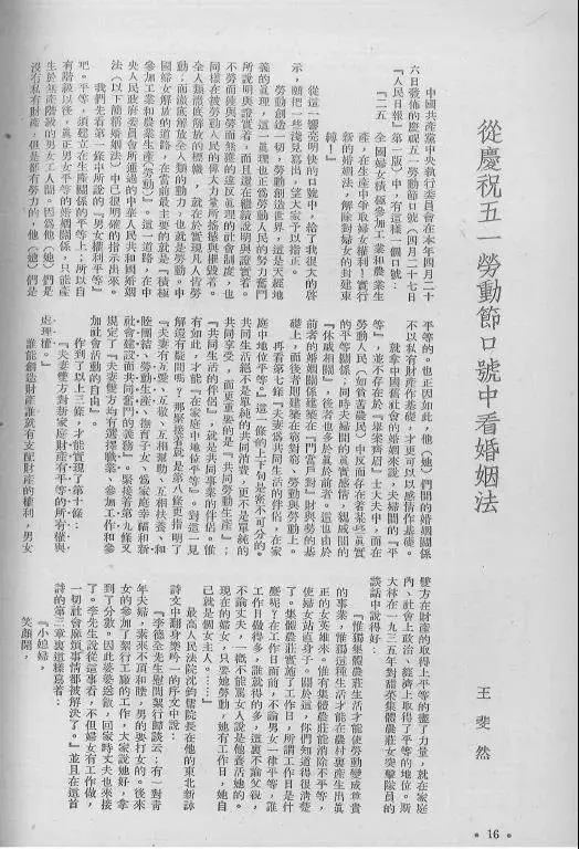 王斐然在《新中国妇女》上发表的题为《从庆祝五一劳动节口号中看婚姻法》的文章。在审判实践中,王斐然带领法院大胆创新,试行了集体调解、巡回审判、就地审判等审判方式,对新中国司法制度的建设与完善产生了深远影响。