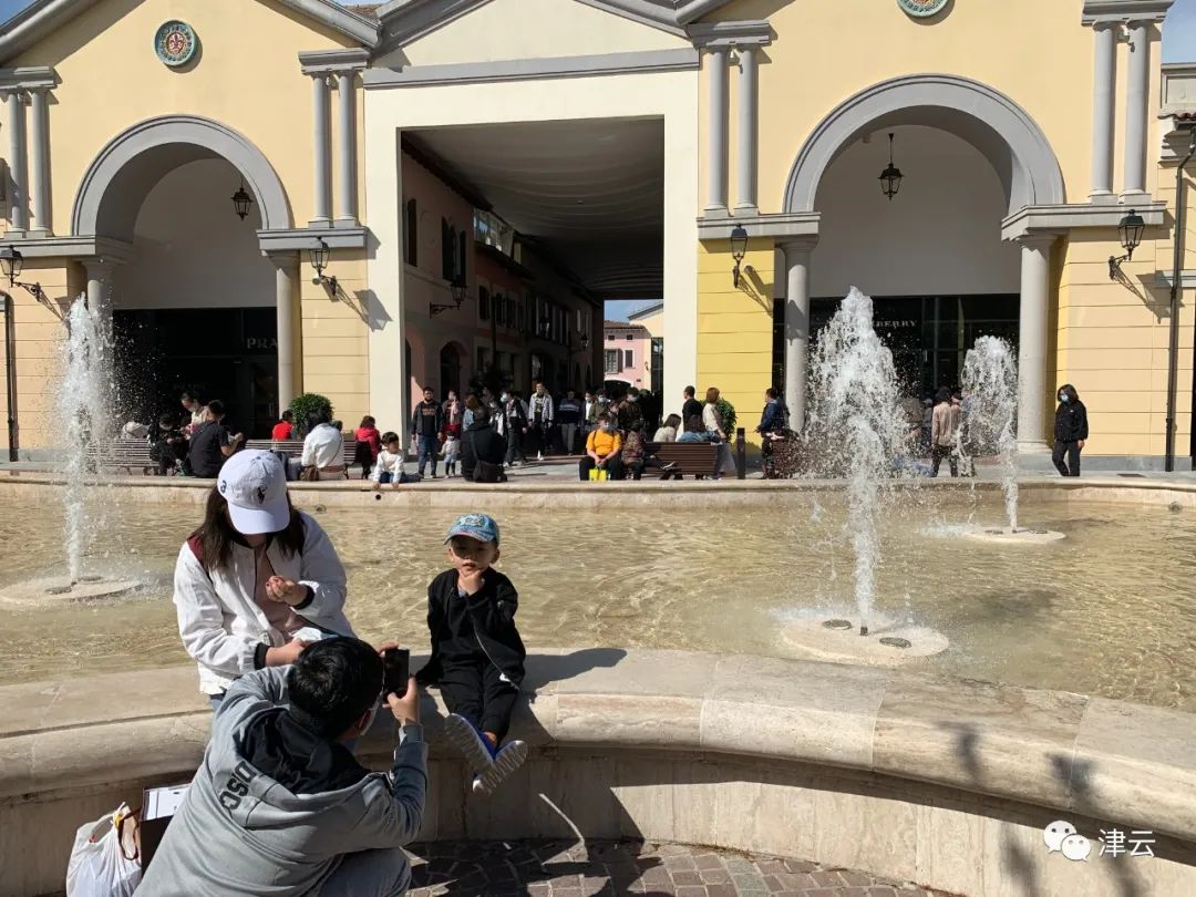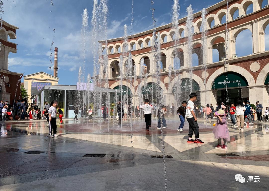 走进小镇,店铺内外都有不少正在休闲购物的人;水池边和喷泉广场上,还有许多家长带着孩子们在戏水拍照。