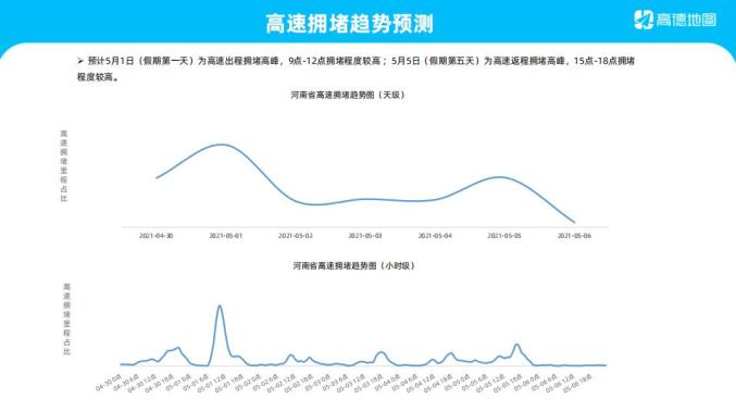 从车流量时段看,预计2021年“五一”假期每日流量维持高位,返程高峰时段大流量局部聚集,日间、夜间车流比例4:1。从假期每日车流量分布上看,预计假期日间8时至20时,车流量占80%左右,夜间当日20时至次日凌晨8时占20%。其中,白天客车流量占85%左右,货车流量占60%左右。
