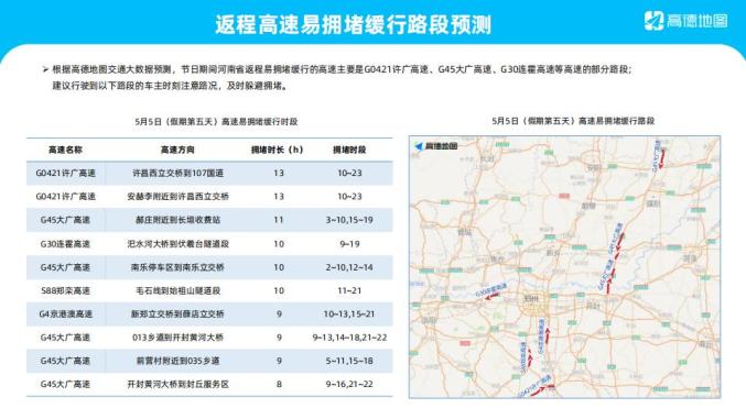 【返程高峰时段】一定要避开假期最后一天下午返程高峰,请提前返程,错峰返程。要特别注意假期最后一天5月5日下午返程高峰,尤其是下午17时至19时省内主干高速公路及返郑下站车辆骤增,易出现排队缓行现象,注意提前返程,错峰返程。