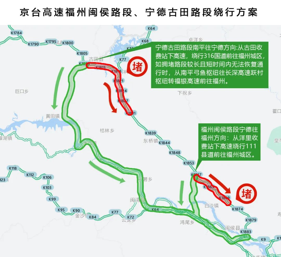 绕行线路:从古田收费站下高速,绕行国道316线前往福州城区,如拥堵路段较长且短时间内无法恢复通行时,从南平弓鱼枢纽往长深高速跃村枢纽转福银高速前往福州。3
