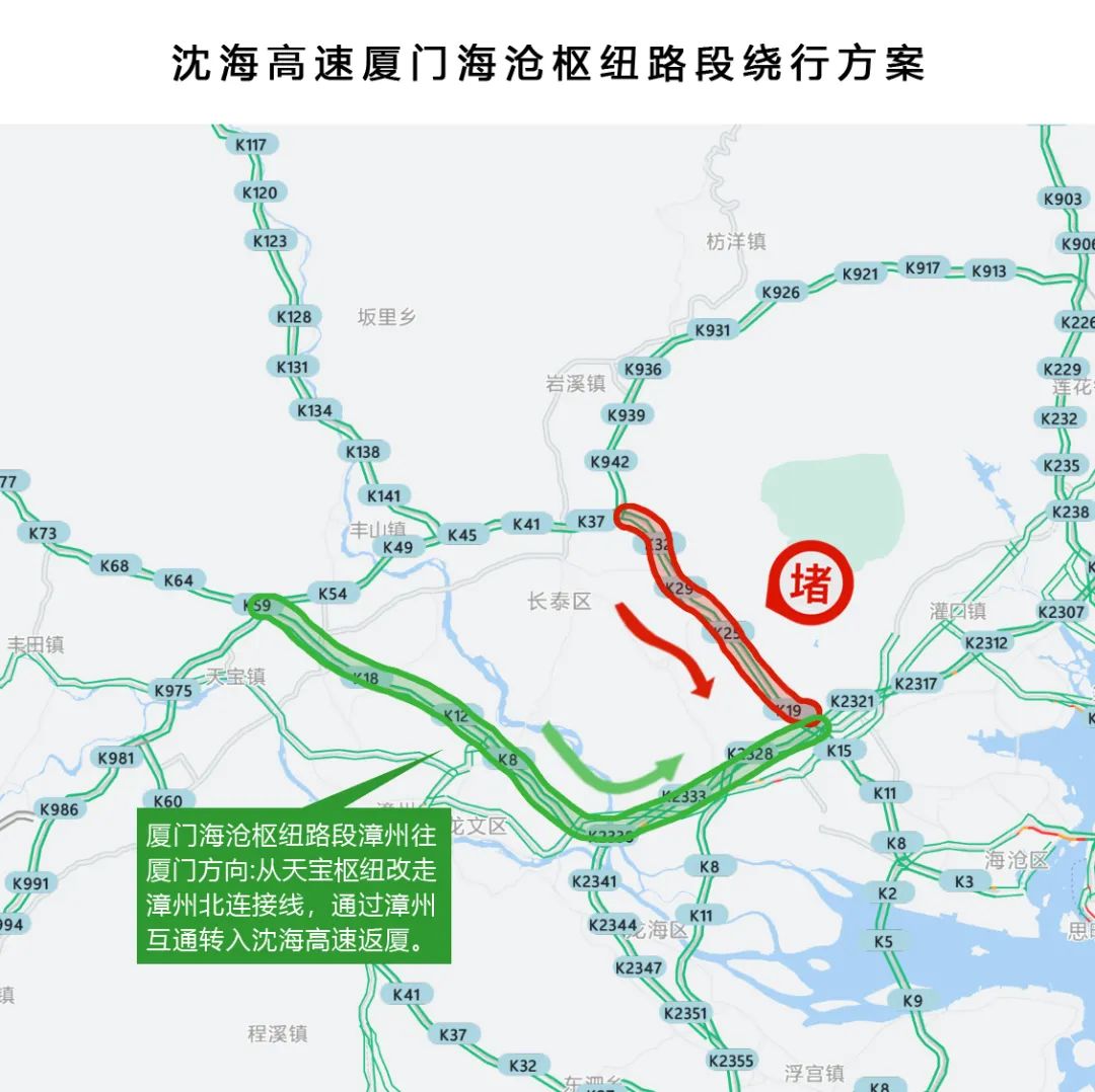 绕行线路:从天宝枢纽改走漳州北连接线,通过漳州互通转入沈海高速返厦。5