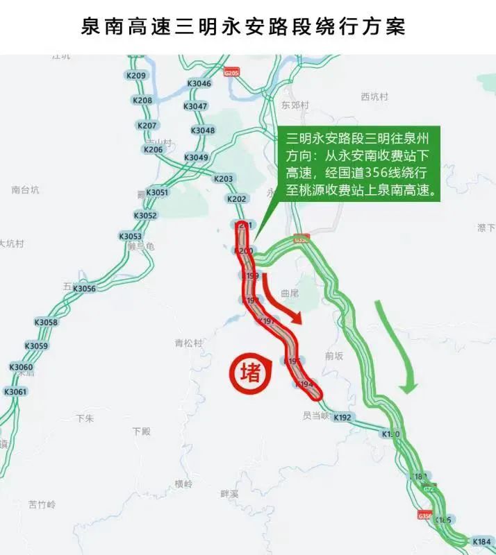 绕行线路:从永安南收费站下高速,经国道356线绕行至桃源收费站上泉南高速。9