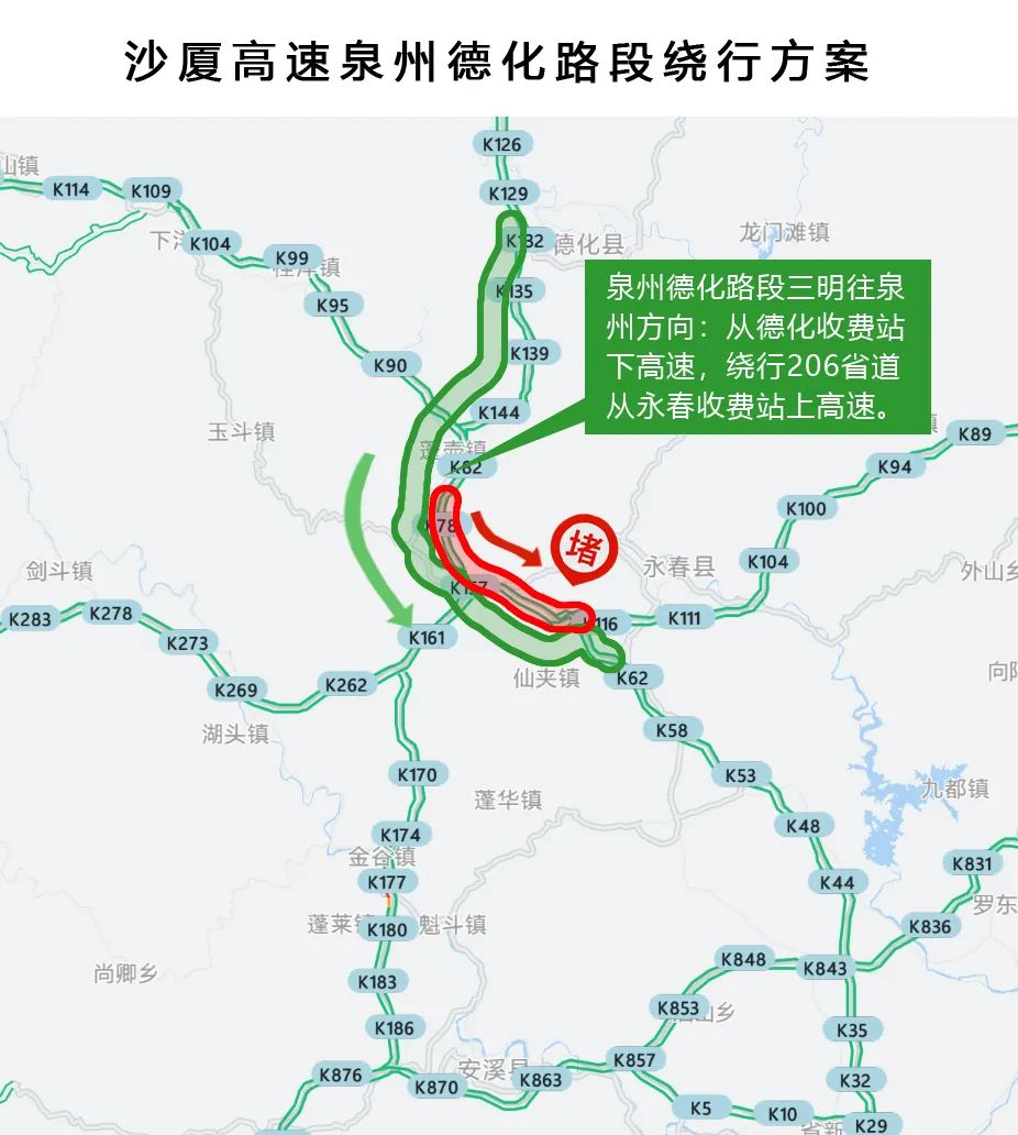 绕行线路:从德化收费站下高速,绕行省道206线从永春收费站上高速。10