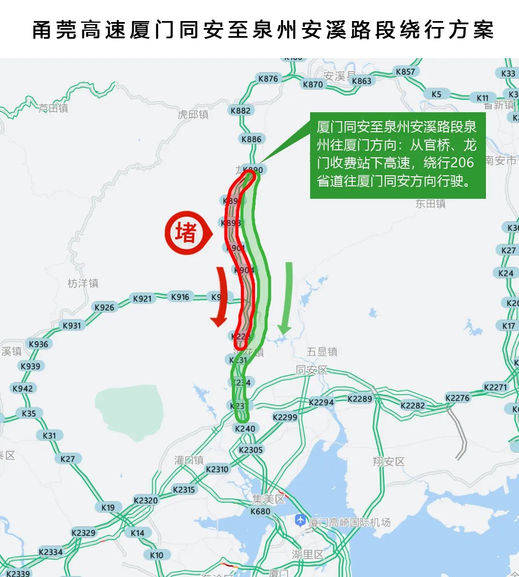 绕行线路:从官桥、龙门收费站下高速,绕行省道206线往厦门同安方向行驶。11