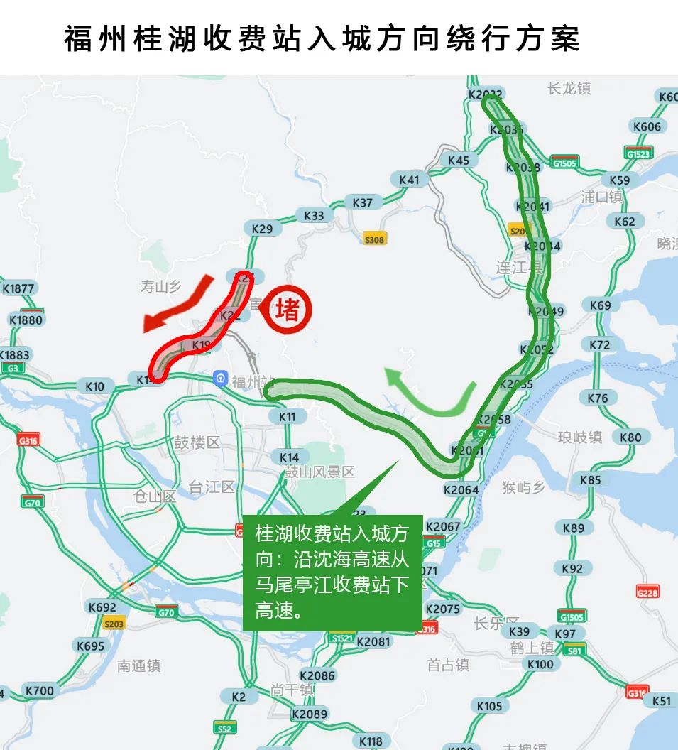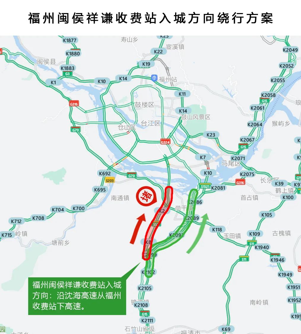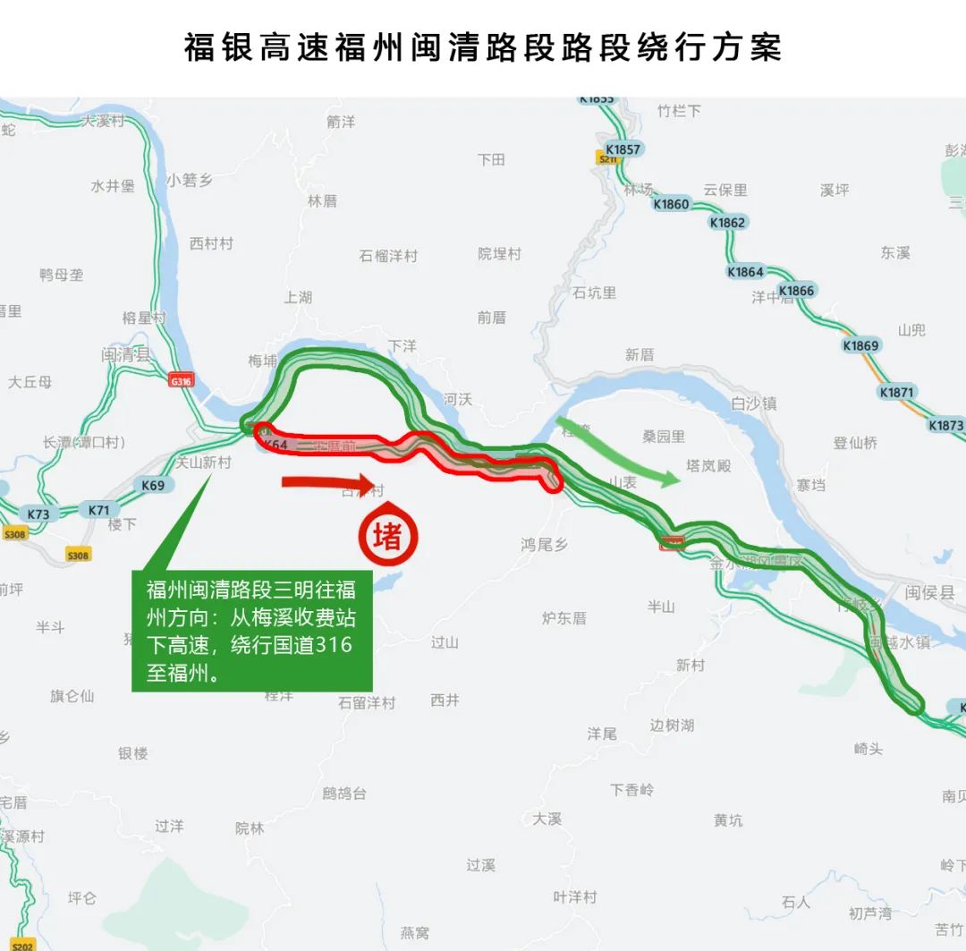 绕行线路:从梅溪收费站下高速,绕行国道316线至福州。12