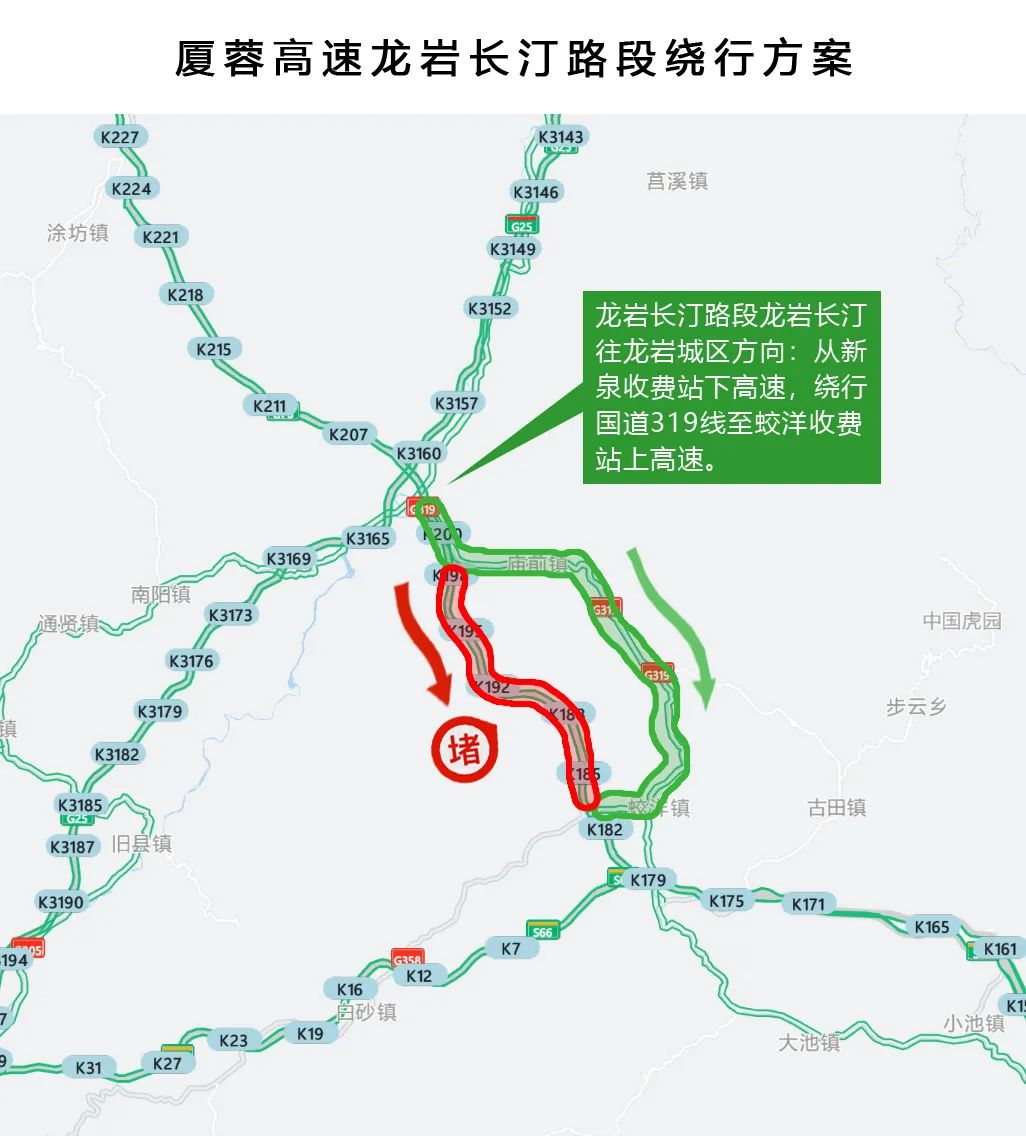 绕行线路:从新泉收费站下高速,绕行国道319线至蛟洋收费站上高速。13