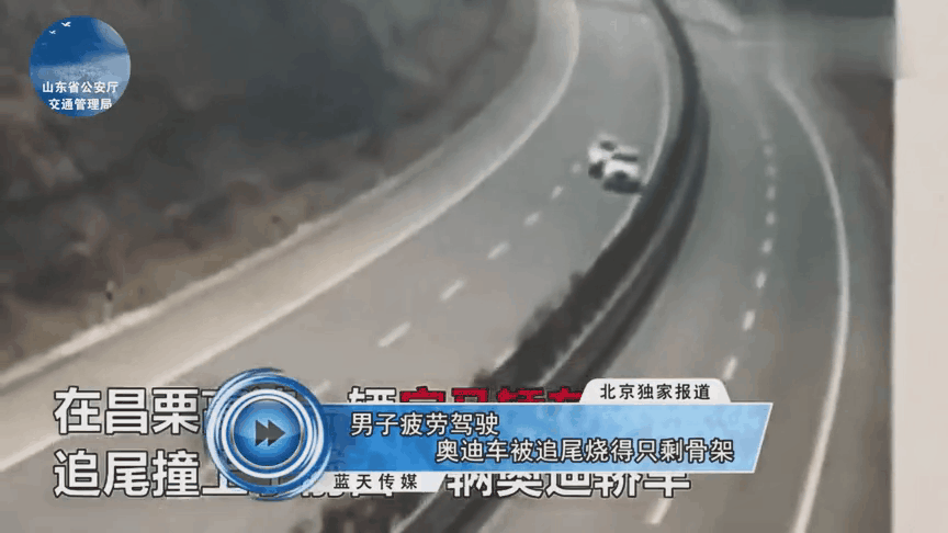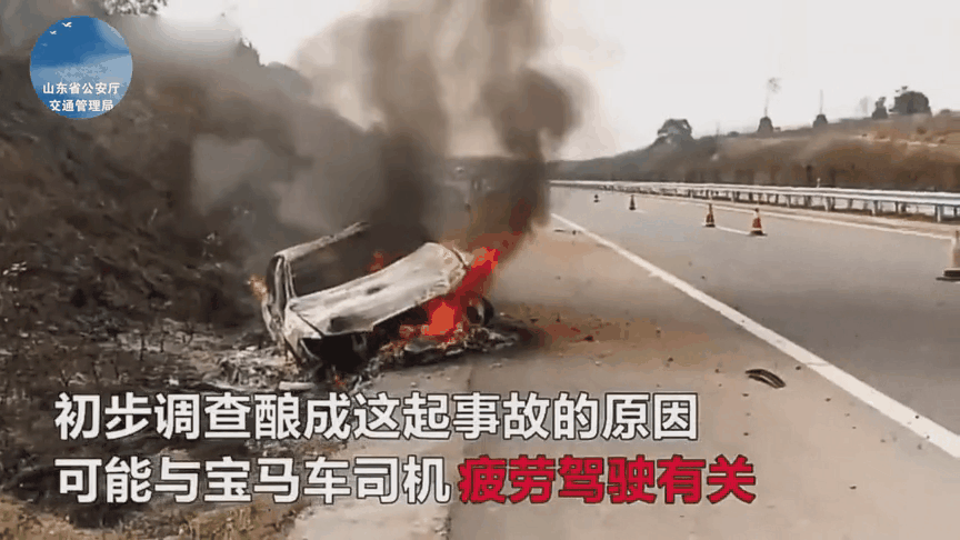 近日,在某高速上,一名驾驶人在行车中犯困,追尾前方车辆,使其完成了一个“华丽的漂移动作”。事后被追尾车辆起火,烧得只剩骨架,所幸车上人员及时撤离,并无伤亡。