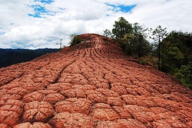 老君山国家公园黎明景区黎明丹霞地貌区是国内面积最大、发育最完整的丹霞地貌。黎明丹霞地貌以其高海拔而著名,由于海拔高,形成极端的“冻融”气候,造就了神奇的丹霞地貌,其中包括“龟甲”地表分布类型,最为典型有千龟山。