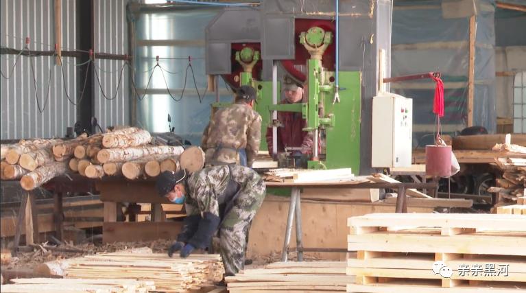 在黑龙江新丝路林产品有限公司的锯材车间里,工人们在锯木机械旁加紧工作。这个锯材车间2020年11月份正式投产,受年初新冠疫情影响,企业在今年4月初才复工复产。