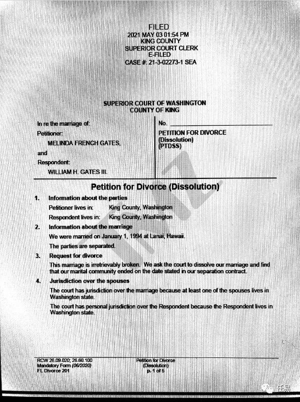 比尔盖茨和妻子梅琳达在5月4日发布了一个声明,称「两人认为继续保持婚姻关系已经无法让彼此继续提升」,而且时代华纳旗下的名人八卦新闻网站TMZ,也公布了盖茨的离婚申请文件,离婚申请是梅琳达起草的,理由是婚姻破裂无法挽回。
