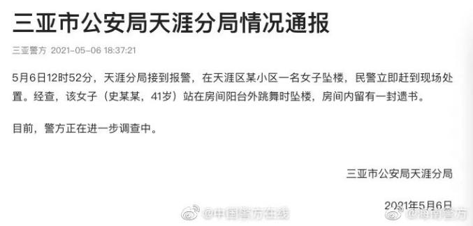 5月6日12时52分,天涯分局接到报警,在天涯区某小区一名女子坠楼,民警立即赶到现场处置。经查,该女子(史某某,41岁)站在房间阳台外跳舞时坠楼,房间内留有一封遗书。目前,警方正在进一步调查中。