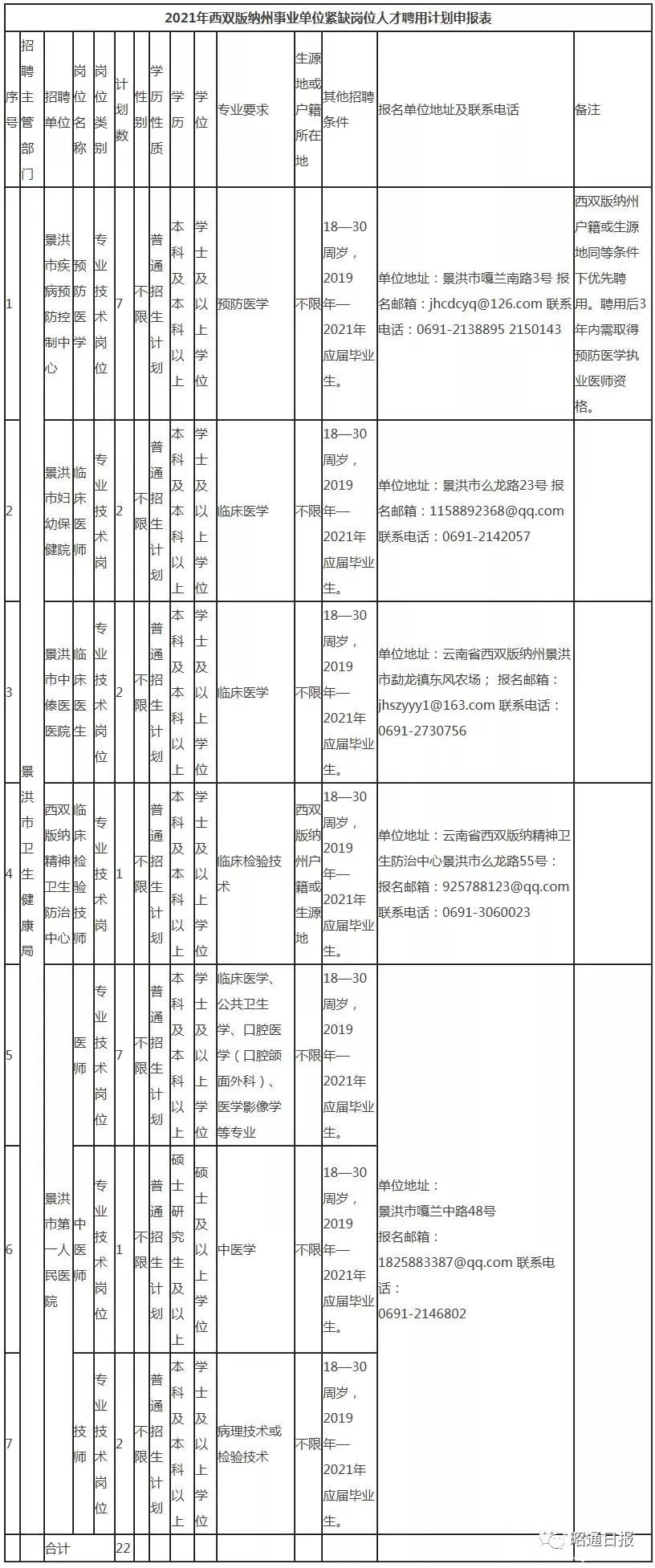 本次招聘采取网络报名及现场招聘的方式,网络报名请报考人员于5月9日前将《2021年景洪市卫生健康局事业单位紧缺人才聘用报名登记表》、《承诺书》及相关材料电子版报送至指定邮箱。其中景洪市第一人民医院采取网络报名及现场报名两种方式,具体要求见《西双版纳州景洪市第一人民医院招聘简章》。报名时间:2021年4月28日起至2021年5月9日。