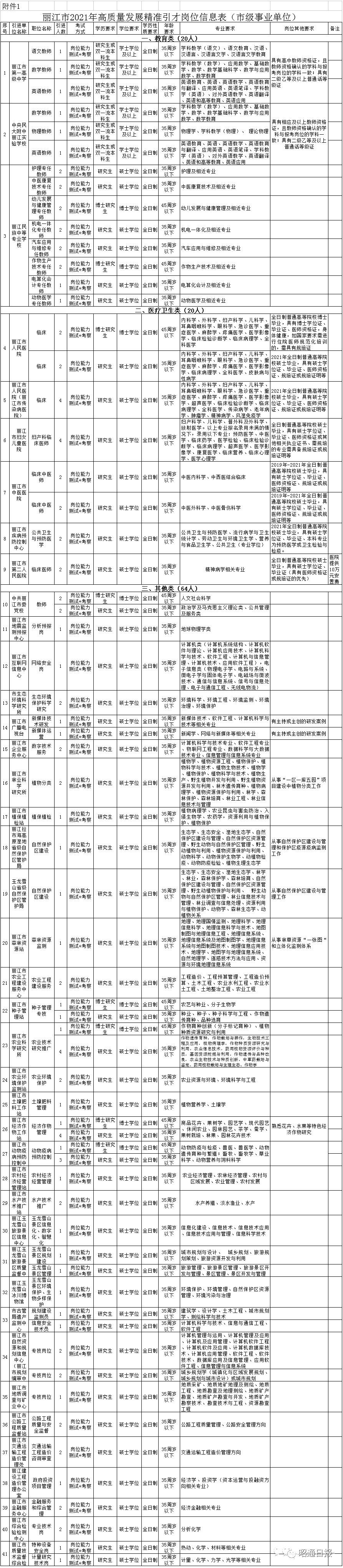 本次急需紧缺专业卫生技术人才引进的报名时间、地点、材料提交、资格审核、考试方式等具体业务按引进单位的公告执行。丽江市(市级事业单位)