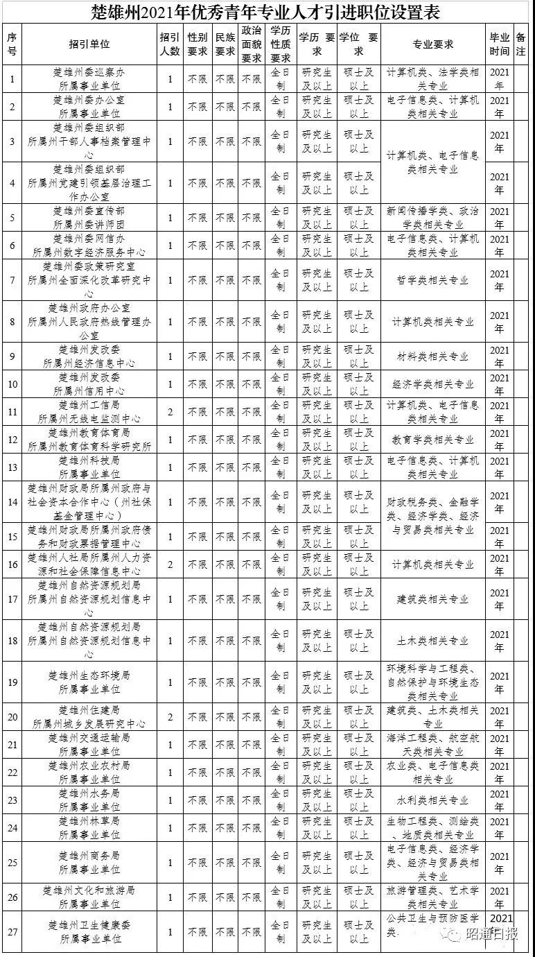 2.报名时间:2021年5月3日起至2021年5月9日24:00。3.报名所需材料:⑴楚雄市事业单位2021年人才引进报名表;⑵毕业证、本人身份证、就业推荐表、就业报到证及在校期间学习成绩证明等材料。⑶其他优秀表彰或特长证明材料等。