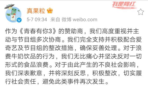 7日上午,蒙牛乳业(集团)股份有限公司官方微博@真果粒发布致歉声明称,完全支持并积极配合爱奇艺及节目组的整改措施,确保妥善处理。对于由此产生的不良社会影响,深表歉意,并将深刻反思,积极整改,切实履行社会责任,避免此类事件再次发生。3