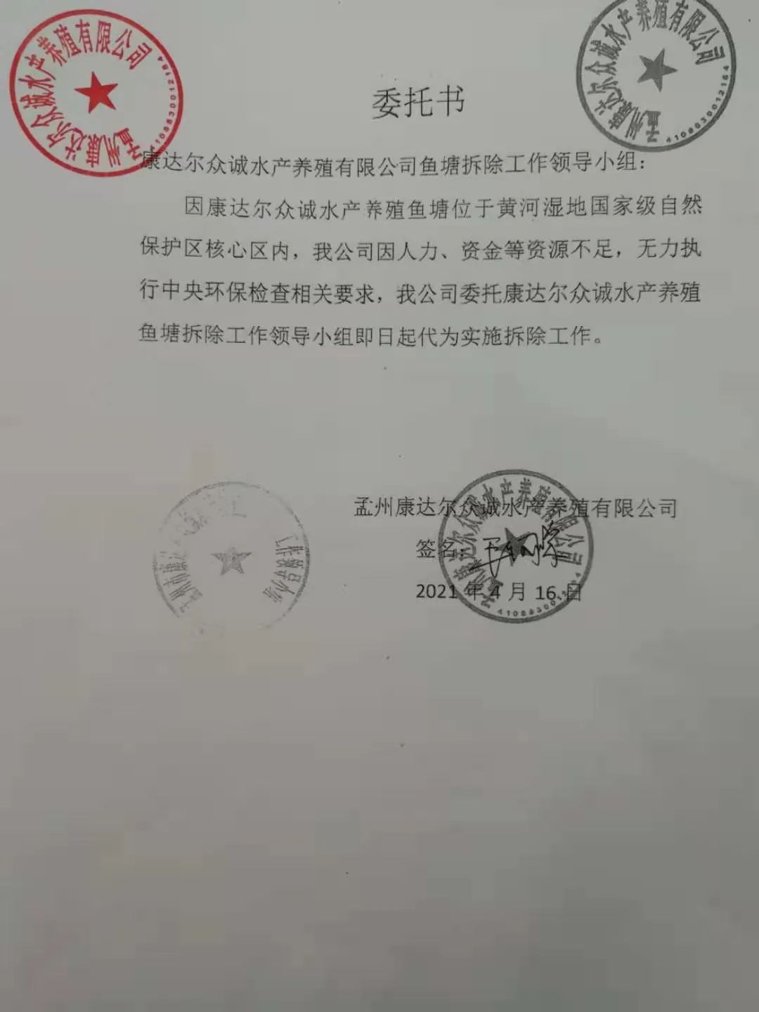 随后督察组调研相关材料,发现了康达尔公司的一封委托书,上面提及“因无力执行中央环保检查相关要求……”对此,督察组对这里上千亩鱼塘展开了更深入的调查。