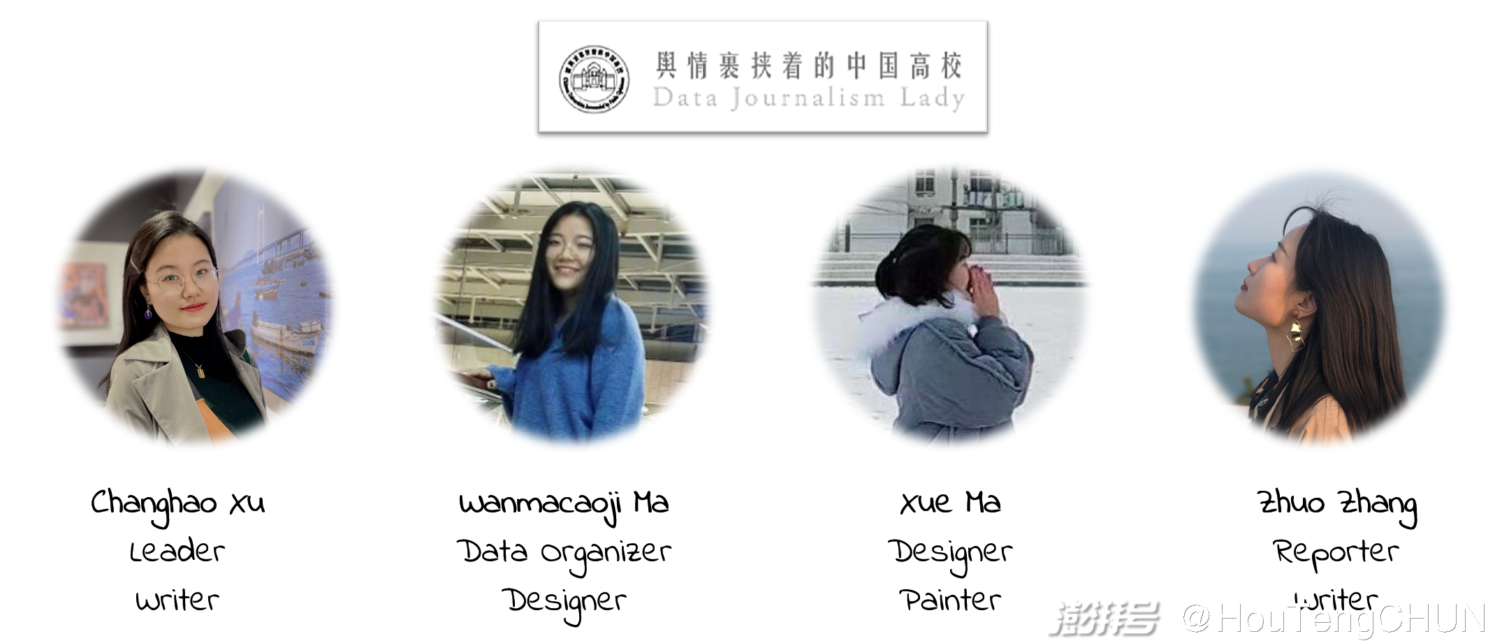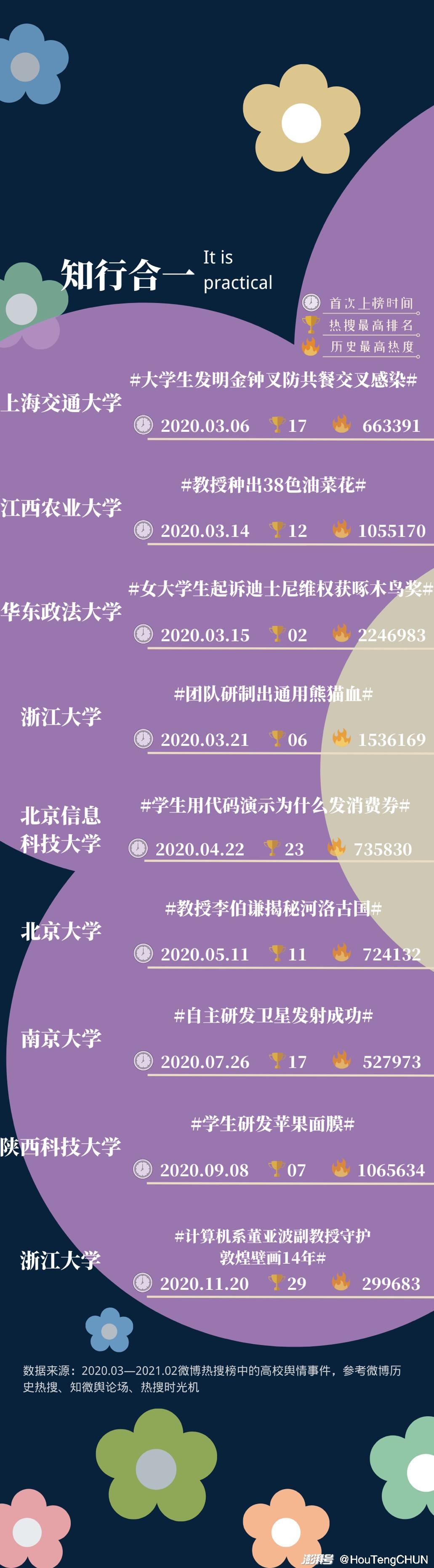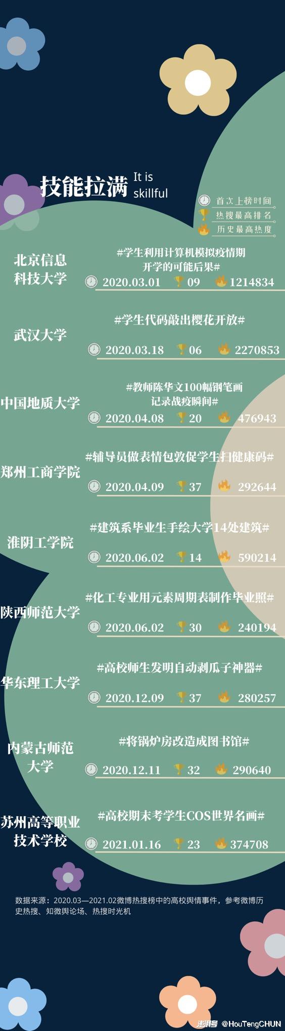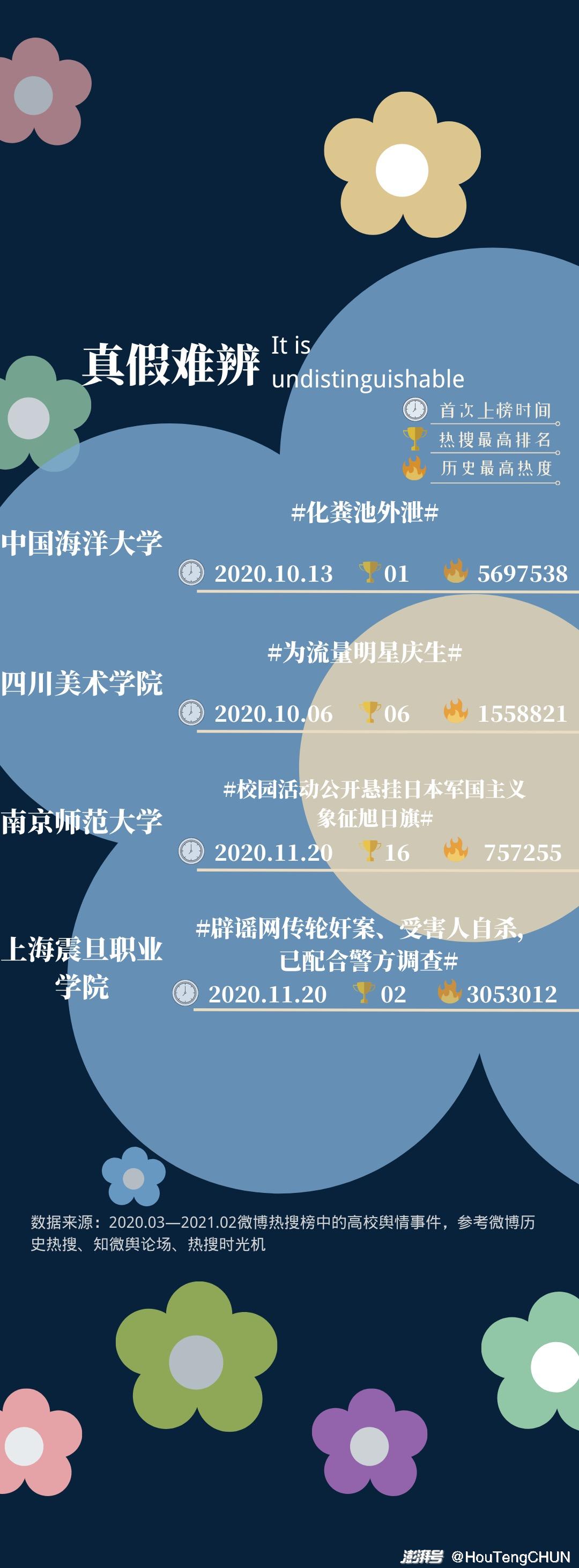 “舆情裹挟着的中国高校”毕设团队汇聚着网瘾少女。因此,我们名正言顺地以微博热搜为主要阵地,辅以微信、抖音、快手、今日头条、百度、知乎平台,逐条筛选其间数据,整理了2020.03—2021.02一整年的高校舆情事件。