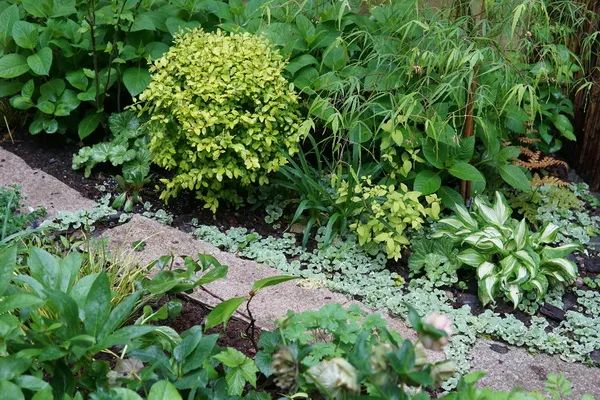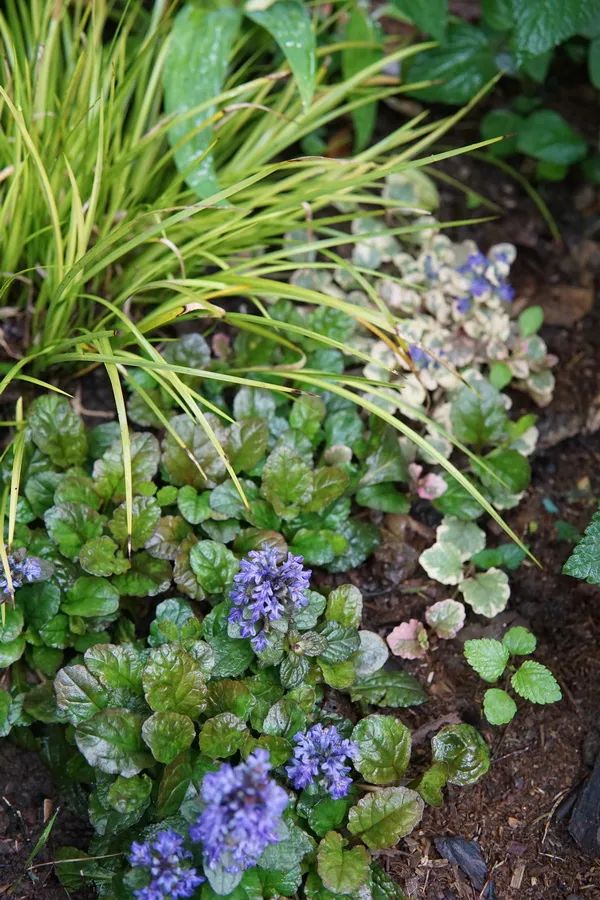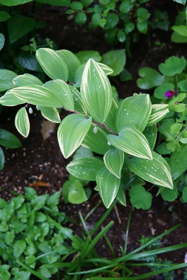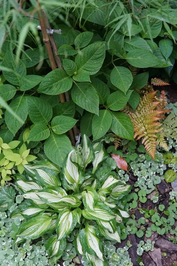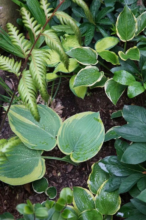 花叶八角金盘、箱根草、玉簪、顶花板凳果、常春藤、络石、筋骨草、石菖蒲、菲黄竹和菲白竹、鳞毛蕨“秋色光辉”,还有好多美丽的林下植物。