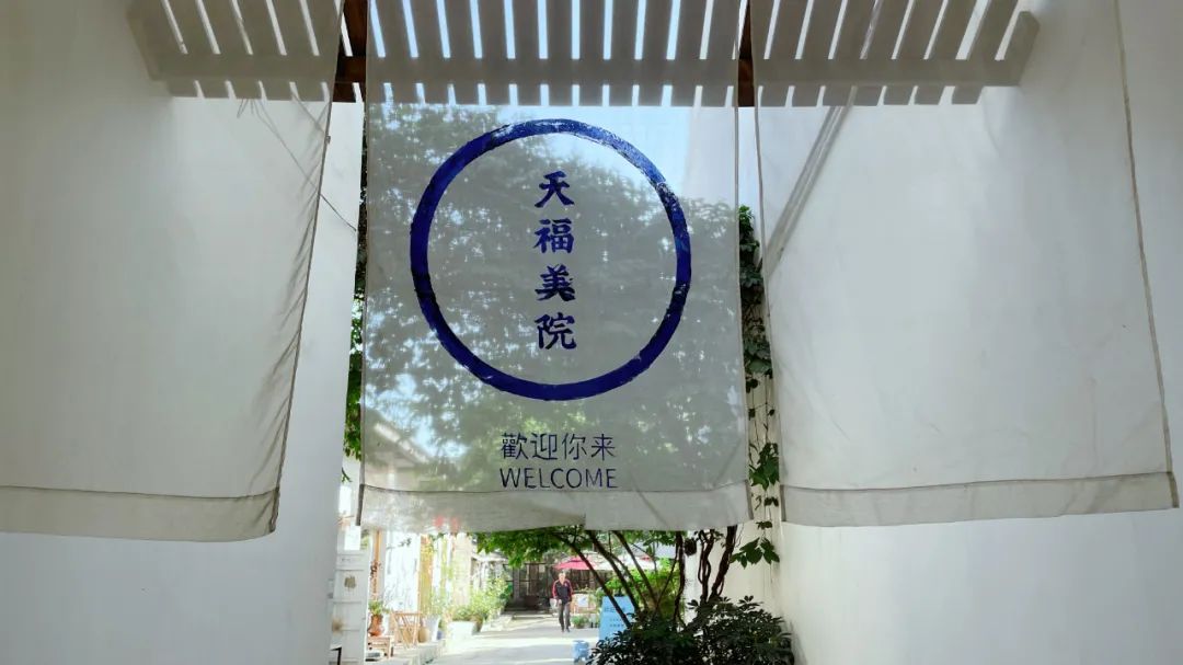 从成都出发,导航“1458文创园”,开车一个多小时,抵达安仁古镇天福街,街道清净整洁,两旁的木头房屋多闭着门。来到148号,见一扇小木门,白色布帘,上书“天福美院”几个蓝色的字。