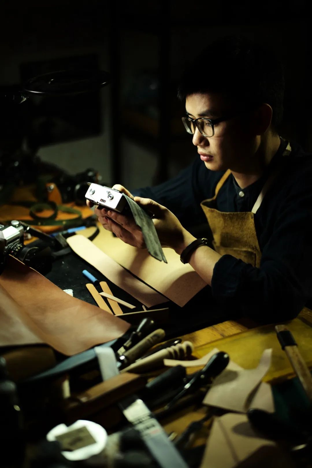 在故市商店隔壁院子里,专心打磨相机套的大鱼忘了吃晚饭。2011年就开始学习皮具设计制作的他,2013年开了淘宝店,2015年入坑复古相机开始,便专心为复古相机做套子。