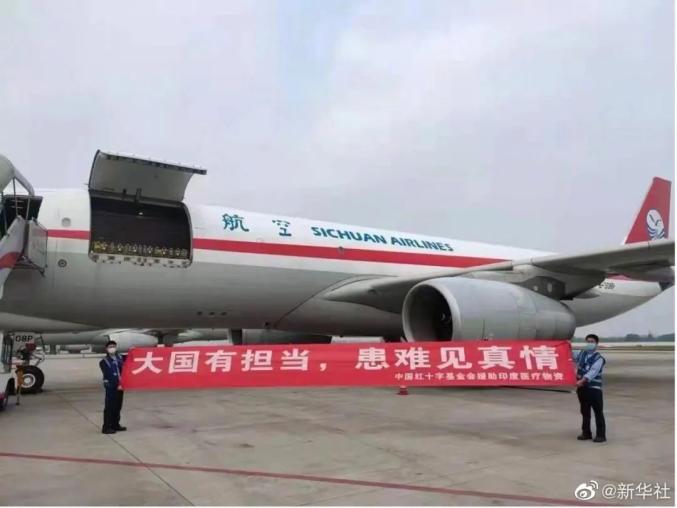 中国给印度捐赠的物资上,印着这八个字:命运与共,战胜疫情