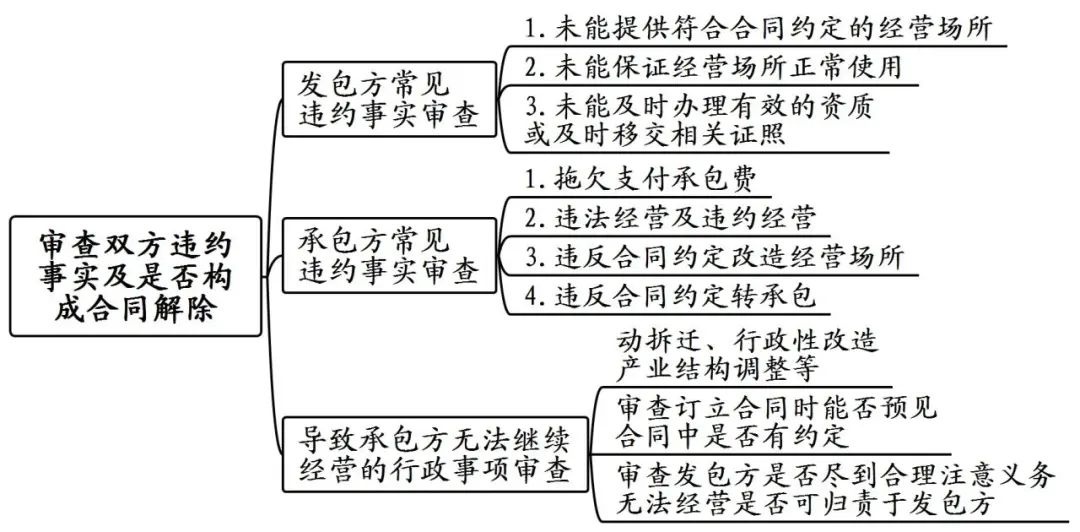 对此,法院应审查上述行政事项是新发生的事实还是合同订立前双方就能预见到的事实。如果合同订立时,双方已能预见到此类行政事项的发生,则应审查合同中有无对此类事项发生时双方责任义务的约定:有约定的从约定,无约定的需审查发包方是否已尽到保证经营场所正常经营的义务及合理的注意义务。发包方未能提供证据证明其已经尽到合理注意义务的,构成违约。如果造成实际无法经营的原因不可归责于发包方,系因合同双方均明知无法继续经营或其他不可预见、不可避免且无法克服的情况,发包方也没有隐瞒重大事项的,则不宜认定发包方违约,合同解除的后果及风险应由双方共同承担。