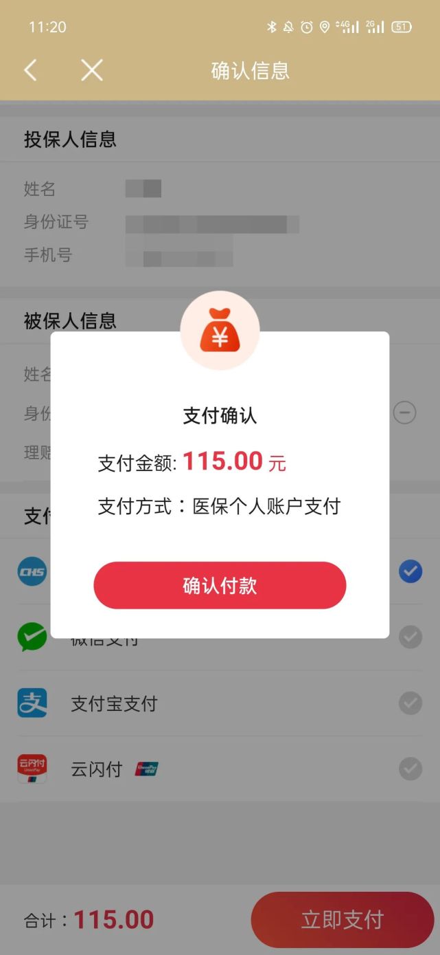 5、支付确认:医保个人账户扣款确认,如果是为多人付款,支付金额为115元*人数