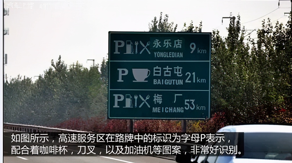 这个是高速路上常见的指示,也是我们高速出行中休整加油的必去地点。高速服务区在路牌中的标识为大写的英文字母P表示,并配合着服务期内代表不同类型的图片进行解释非常好识别。服务区一般提供餐饮,加油站,卫生间,小超市,修理厂等出行人员可能会需要的服务机构,通常每隔50公里左右就会有一个服务区。