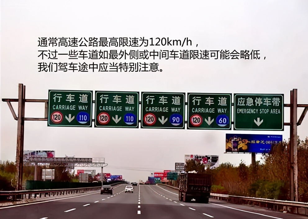 高速路的行车道上方,每隔一段距离会有车道信息的提示,包括限速提示,车道名称都会在此显示。这里需要注意的是,通常高速公路最高限速为120km/h,不过山区桥梁隧道路段限速会只有100km/h或者80km/h。
