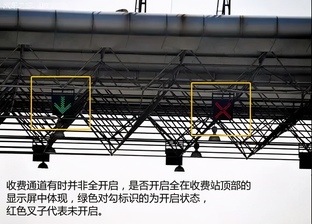 在车流量不大的情况下,收费站的收费窗口并不会全部打开,是否开启信息全在收费站顶部的显示屏中体现,绿色对勾标识的为开启状态,红色叉子代表未开启,大家应该提前观察后做出判断,以免驶入未开启通道,给自己造成不便。