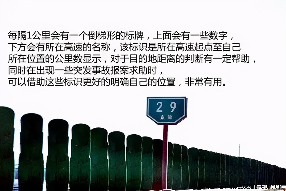 有些时候我们听收音机会听到类似的广播“京港澳高速1450公里处有事故……”,这1450公里就是我们说的距离参考,因此您在听到类似消息的时候可以向驾驶员的左侧,道路中间的护栏处查看,在护栏处每隔一公里都会有一个标牌,您可以通过标牌上的数字来知道您是大约在高速路的距离。