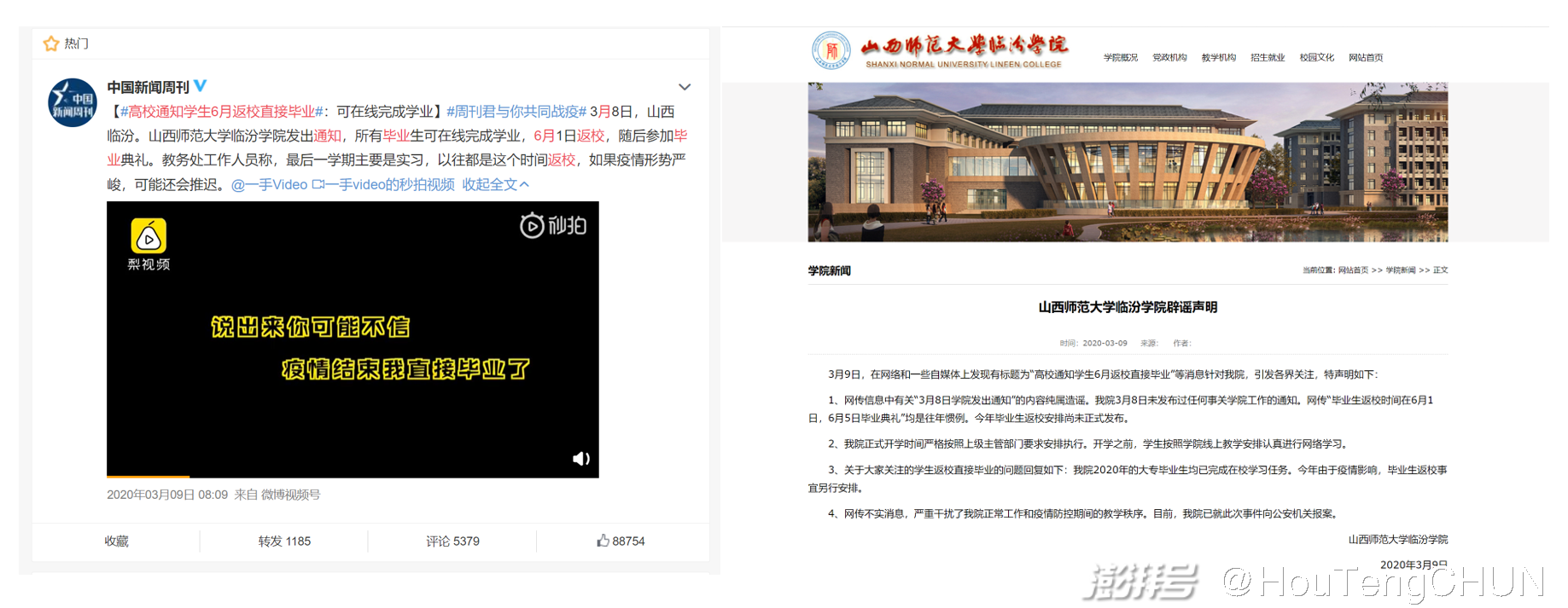 第一条让学生们欢呼的是在2020年3月9日,在随时都准备返校的开学之初,#高校通知学生6月返校直接毕业#算是一则前瞻的通知,令不同地域和不同年级的大学生都眼前一亮。然而,当日,山西师范大学临汾学院的官网和微信公众号就发布了辟谣声明。