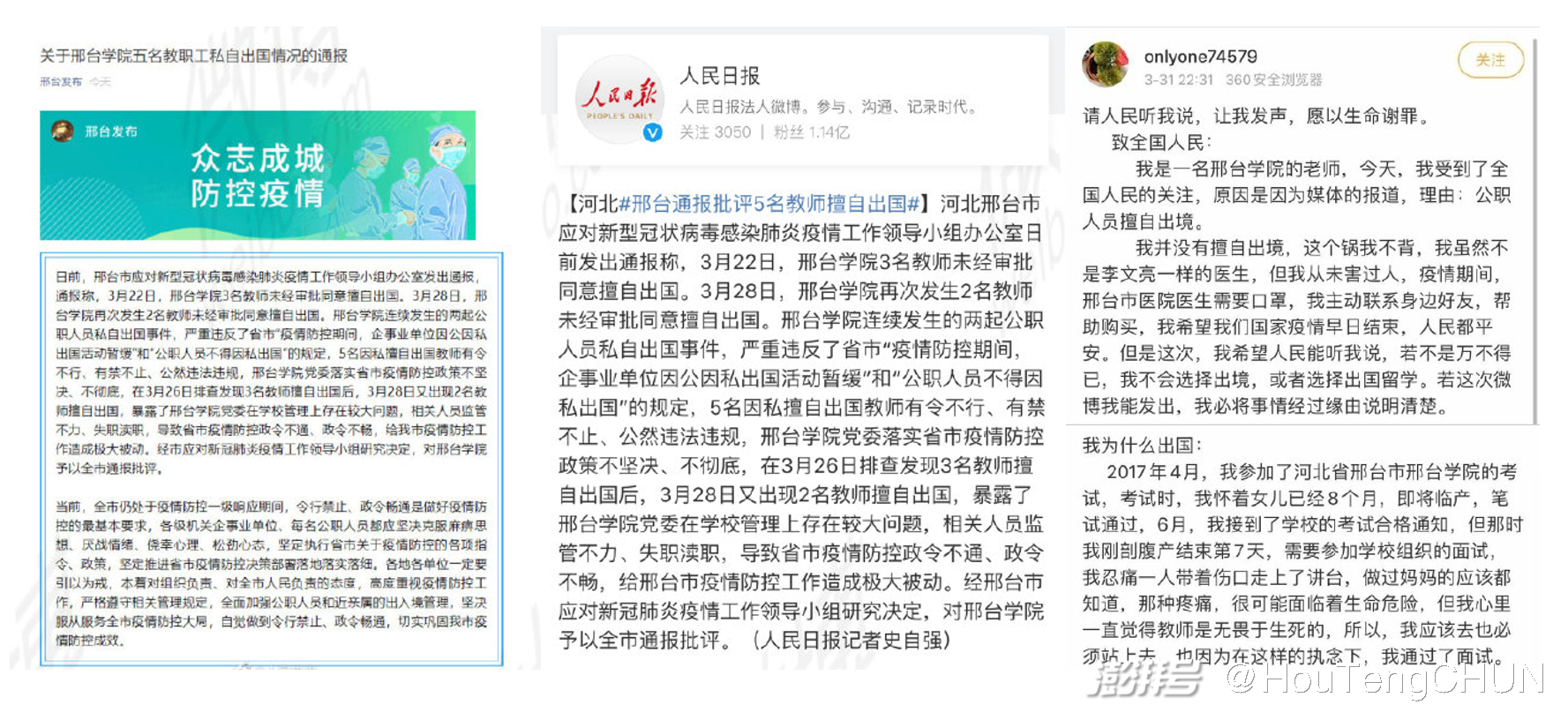 无独有偶,2020年3月底,又有一条正面热搜#邢台通报批评5名教师擅自出国#反转了。微观此条高校疫情管理所引发的舆情变化,也是一波三折——舆论对邢台学院和五名教师骂声一片,直呼“批得好,建议直接开除”,@人民日报 的短评更是扩大了事件的影响;待当事人发声“学业所迫,已按规申请”,校方自查工作并发布详细的《情况说明》,“同情”开麦了;只是,以正视听远不及通报批评带来的热度,仍有网友滞留在起点,谩骂着。