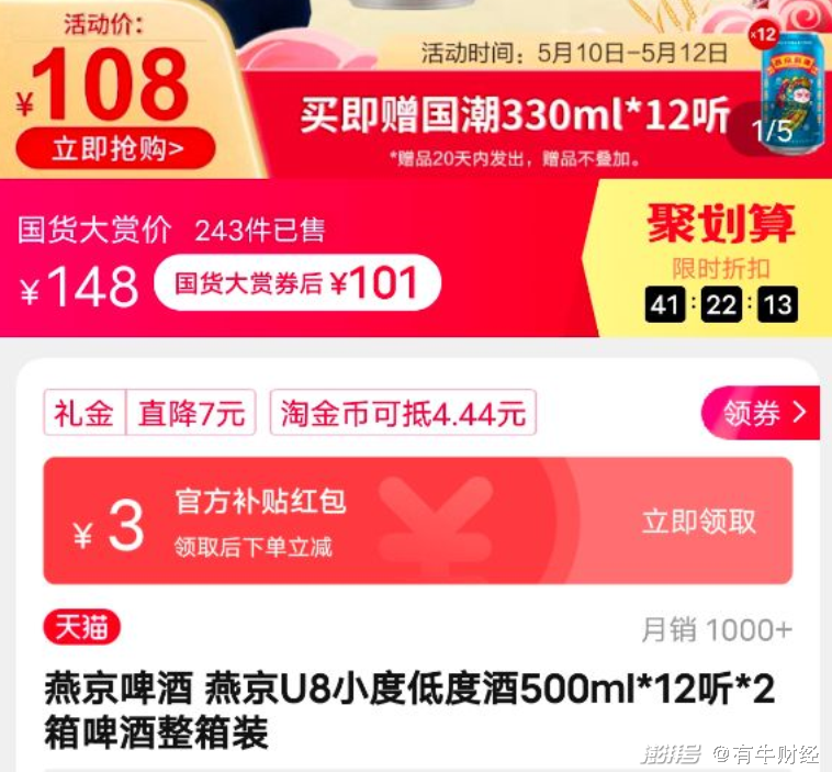 在燕京啤酒的天猫旗舰店里,燕京U8月销量仅有1000+,远远不如勇闯天涯的5000+,而其价格相比勇闯天涯高出一倍。不过燕京U8的销售情况以及价格倒是与青岛纯生非常相似,但是产品规格只有12听,不及青岛纯生的18听。或许是为了将代言效果最大化,与青岛纯生、雪花勇闯天涯不同的是,燕京U8在宣传图上将蔡徐坤放在产品界面中重点凸显。
