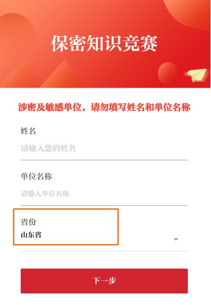 进入考试界面,填写“姓名”“单位名称”,选择“省份”,点击“下一步”开始考试。省份请勾选山东省