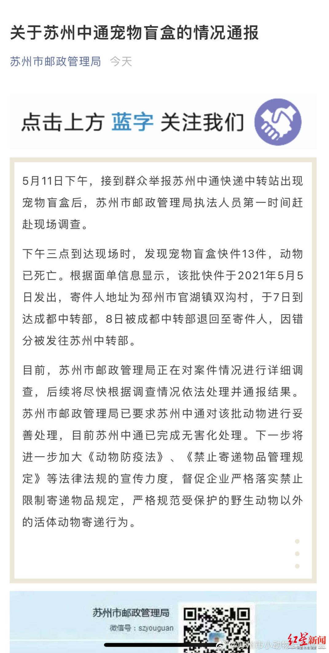 目前,苏州市邮政管理局正在对案件情况进行详细调查,后续将尽快根据调查情况依法处理并通报结果。苏州市邮政管理局已要求苏州中通对该批动物进行妥善处理,目前苏州中通已完成无害化处理。下一步将进一步加大《动物防疫法》、《禁止寄递物品管理规定》等法律法规的宣传力度,督促企业严格落实禁止限制寄递物品规定,严格规范受保护的野生动物以外的活体动物寄递行为。