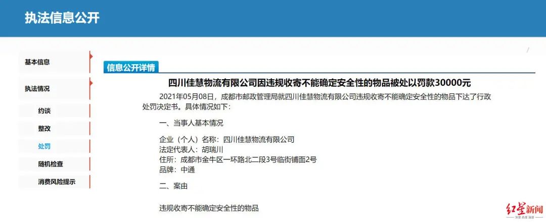 处罚决定5月8日,成都市邮政管理局对此作出处罚,据披露的处罚公告显示,四川佳慧物流有限公司(中通快递成都荷花池网点)在寄件人未提供合法安全证明的情况下,违规收寄活体动物,被罚款30000元。成都中竞物流有限公司(中通快递四川省管理中心)在快件安全保障方面对四川佳慧物流有限公司(中通快递成都荷花池网点)未实行统一管理,被罚款50000元。