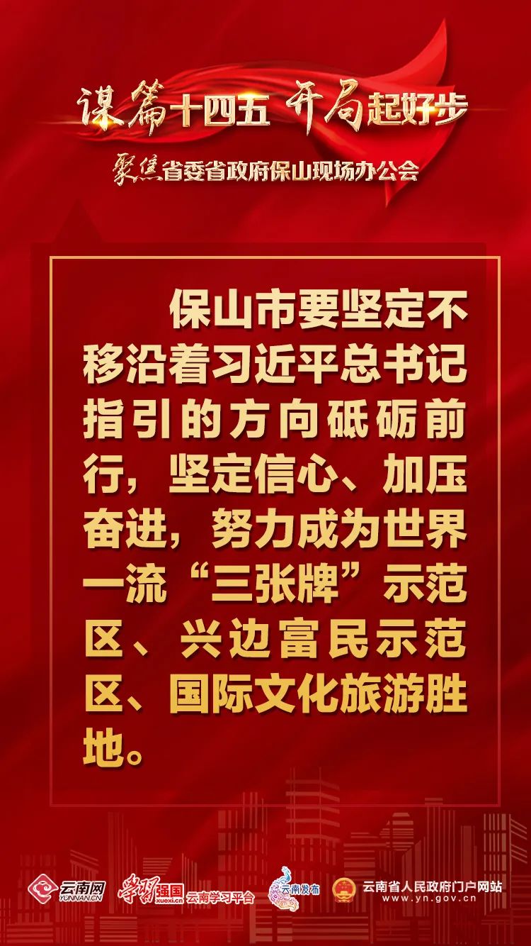 对标到2035年全省与全国同步基本实现社会主义现代化目标,保山市目前处于什么维度、该往何处着力?省委、省政府现场办公会明确提出,保山要努力成为世界一流“三张牌”示范区、兴边富民示范区、国际文化旅游胜地。