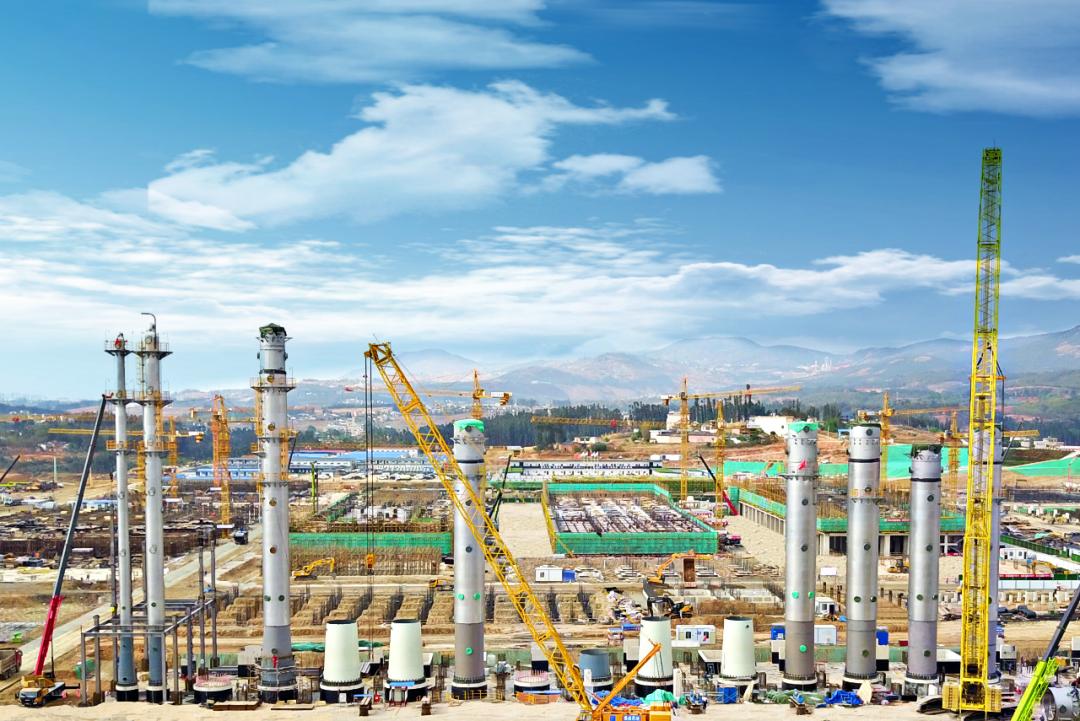 眼下,保山市工贸园区云南通威15万吨高纯晶硅绿色能源项目现场,10余台塔吊正在吊装精馏塔,球罐区、精馏区的工人们正在安装设备,施工现场一片繁忙景象。