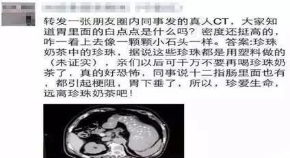 就在微信朋友圈刚刚盛行的年代,有这么一张截图广为流传——有一个朋友去照CT,结果胃里有一颗颗白色点状的东西,那个就是珍珠奶茶的珍珠,是用塑料做的,人不好消化,会引起肠道堵塞。