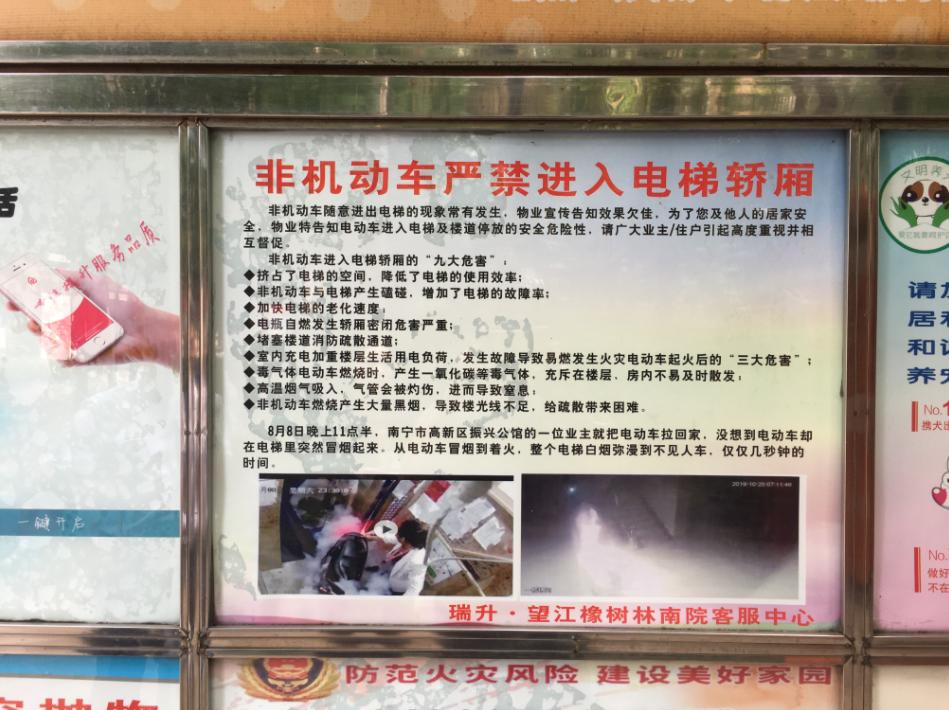 ▲小区内张贴了电瓶车进电梯危害图文资料的宣传栏4月启用电梯门禁