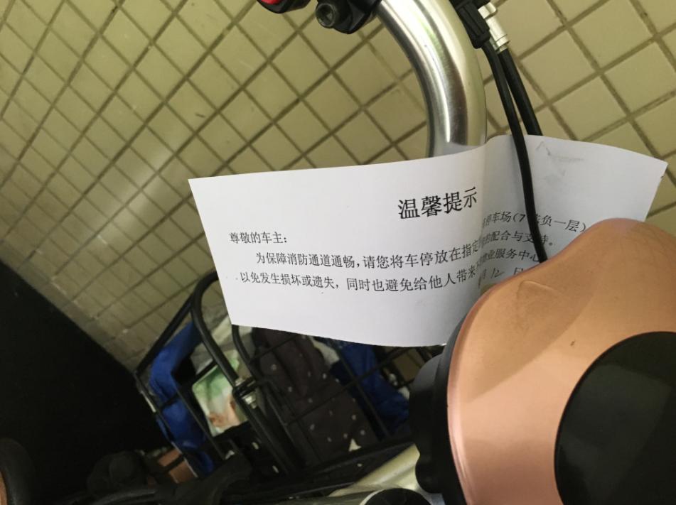 ▲楼道内禁止停放车辆的提示牌物业声音:期待业主配合