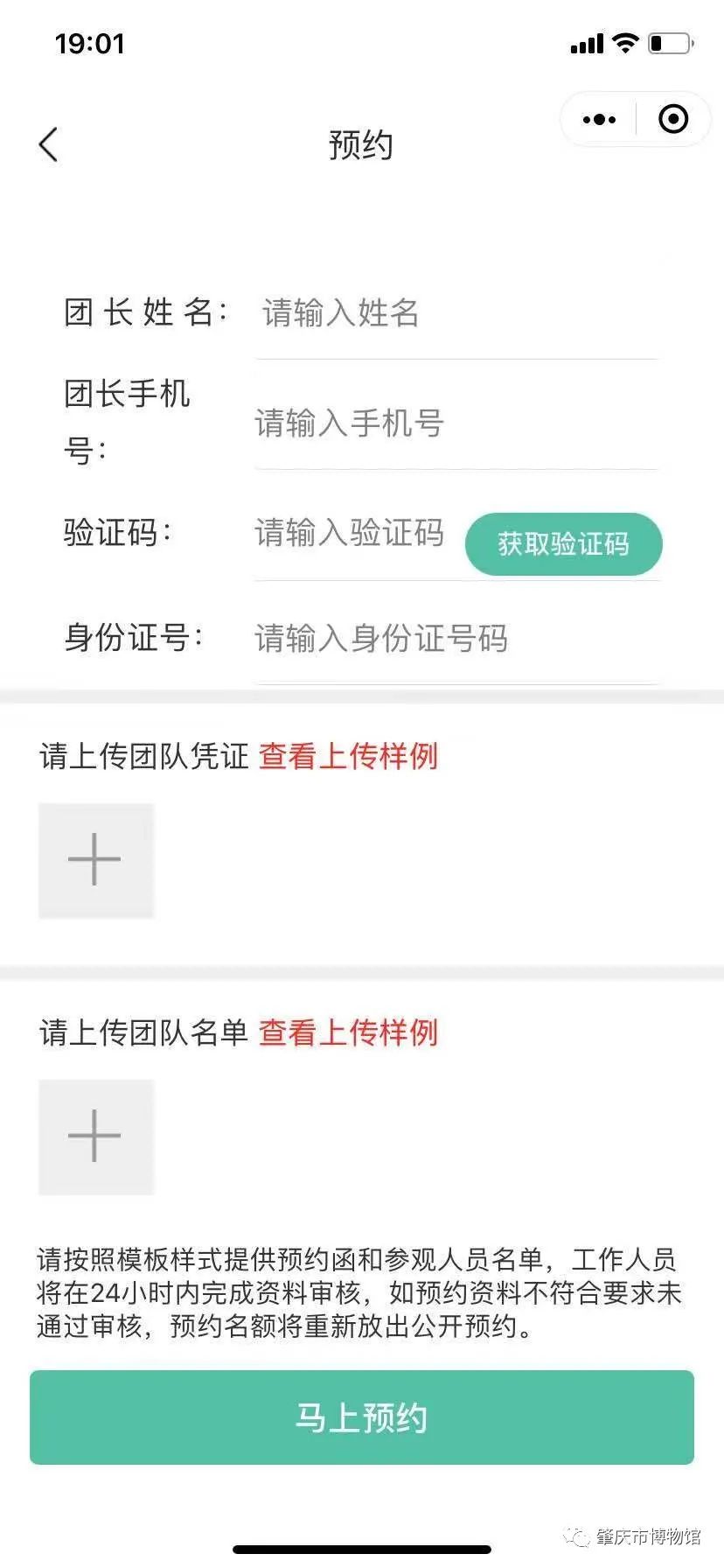 (二)团队预约:团体参观须由活动联系人提前1-7天登陆肇庆市博物馆公众号,在参观预约小程序中,选择团体参观,并附上有效参观函件和具体人员名单进行实名预约。