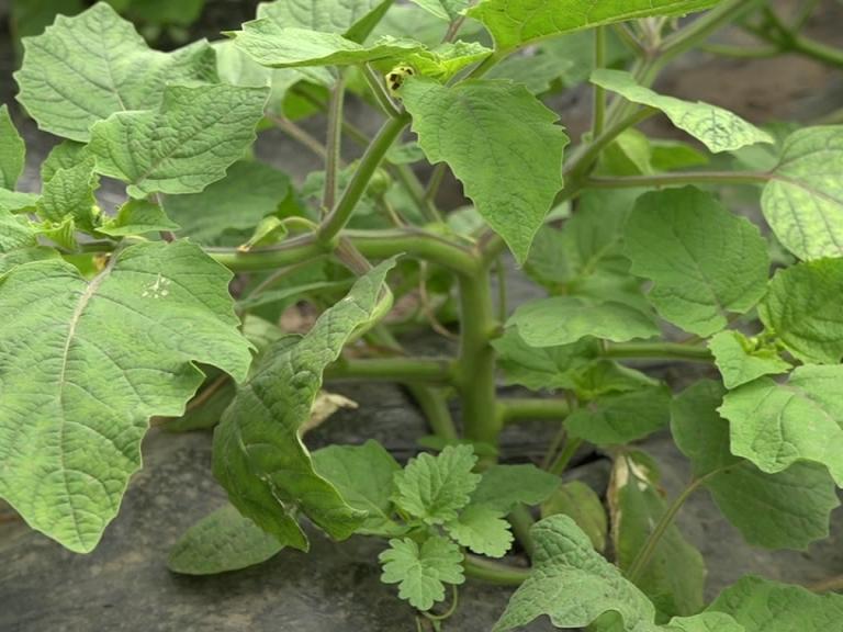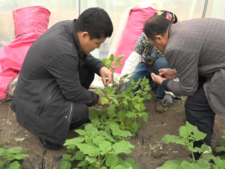 这里是福兴乡棚室种植户王丽红家的菇娘种植大棚。这几天,大棚里部分菇娘秧苗长势出现了一些问题。乡长安峰、乡主任科员蔡振民正同种植户王丽红一同查看菇娘秧苗的情况。