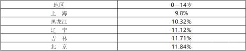 一是14岁及其以下人口比例全国最低是上海,然后是黑龙江,辽宁,吉林,北京。