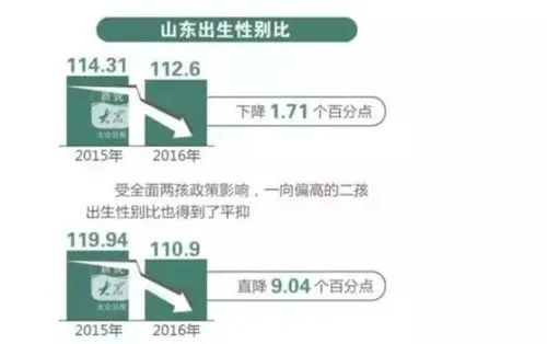 下图是山东省2016年全面二孩的数据,二孩的出生性别比从2015年的119.94下降到了2016年的110.9.
